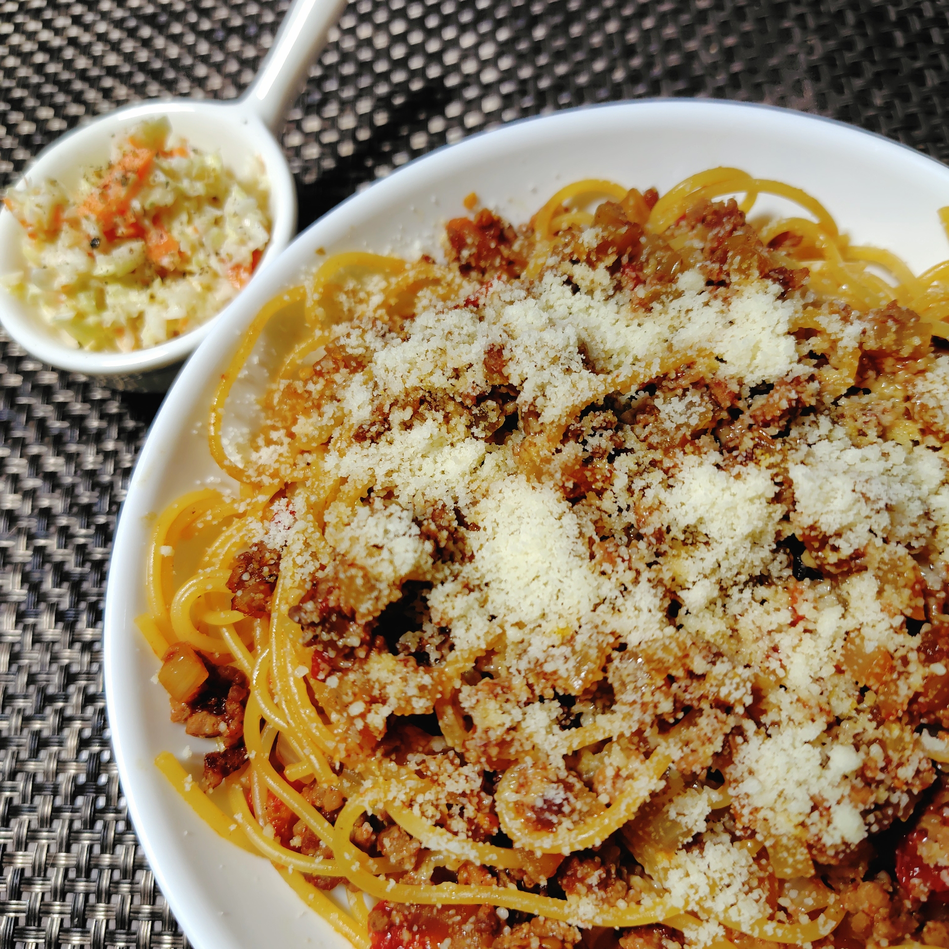 ひき肉が半端に残っていたので、プチトマトと一緒に炒めて、ケチャップやソースも入れてボロネーゼスパゲティを作りました。粉チーズたっぷりが好みです😍