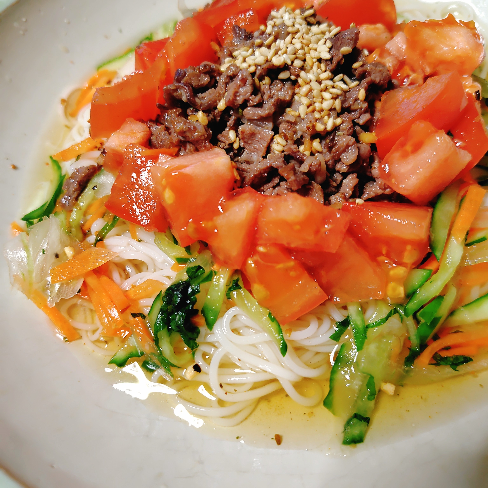 暑い日が続くと、喉越しのいいそうめんが食べたくなりますね。でも、そうめんだけではすぐお腹がすいちゃうので、牛肉を五香粉で味付けて炒めたものを、きゅうり、玉ねぎ、大葉、人参の千切りとトマトと一緒にサラダ風にしてみました。誰はレモングラスを聞かせてさらにエスニックな感じに🥰