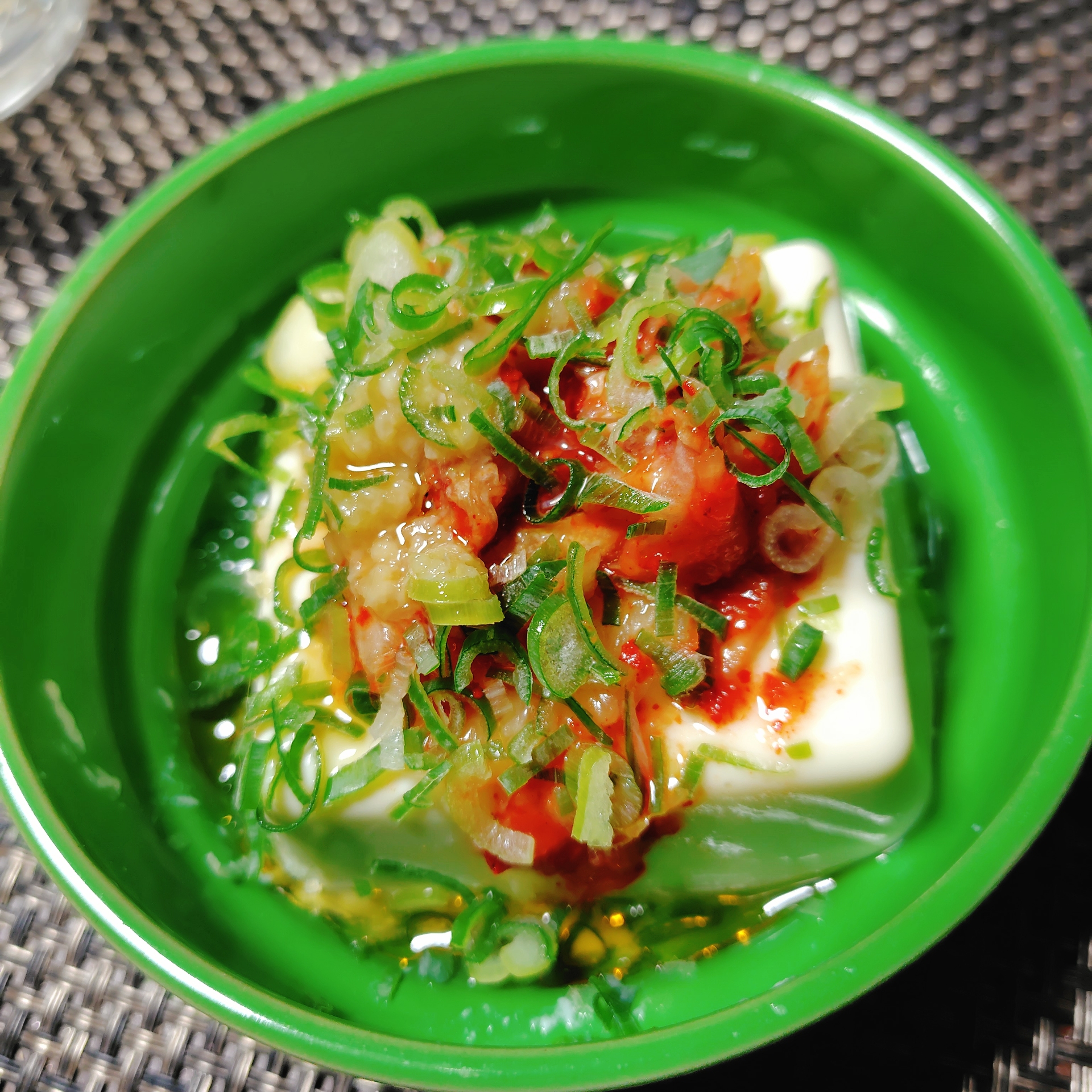 秋に食べたい食材には「お豆腐」もあります。夜遅い時間の夜食には、キムチと香味塩麹(大蒜・生姜・玉ねぎの塩麹)と青ネギをタップリ乗せてごま油をちょっとかけた発酵冷ややっこが定番です。