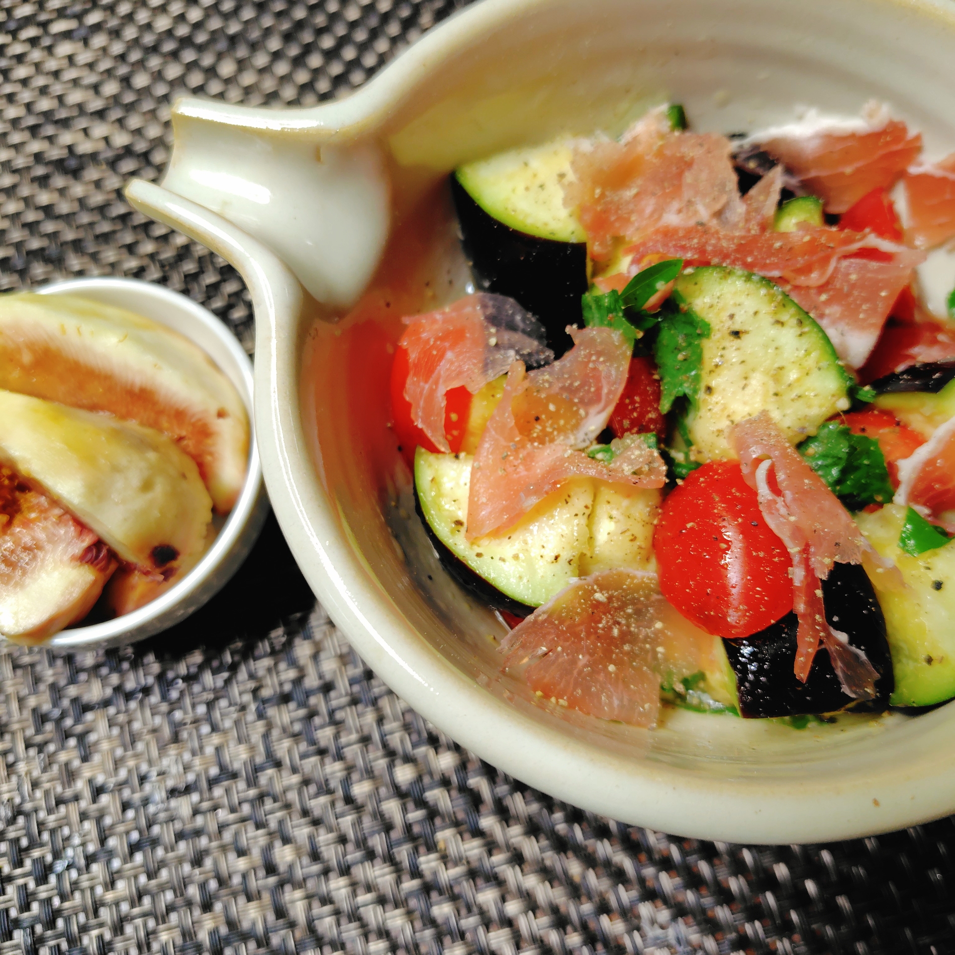 生ハムって秋のフルーツと相性がいいのはわかるんだけど、もしかしたらフルーティな水茄子とも相性いいのでは?と思って作ってみました。茄子の下ごしは、薄めた白だしでしばらくつけておいたので水っぽくならずにおいしくなりました。この時期に、気のめぐりをよくしてくれる大葉もたっぷり使いました。