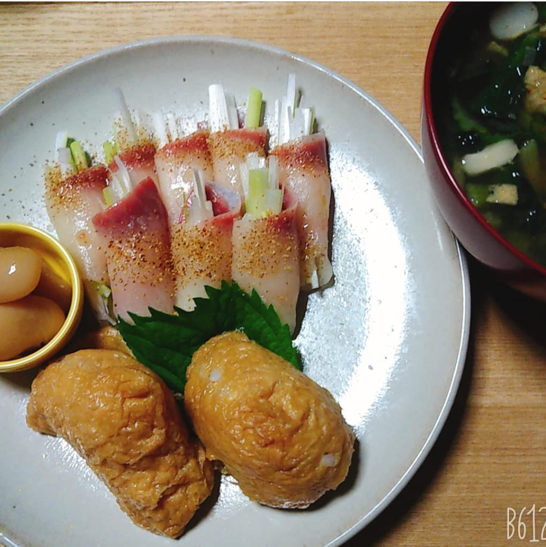 大好きな鰤で長ねぎの千切りを巻いて、岩塩と山椒とごま油でいただきます。