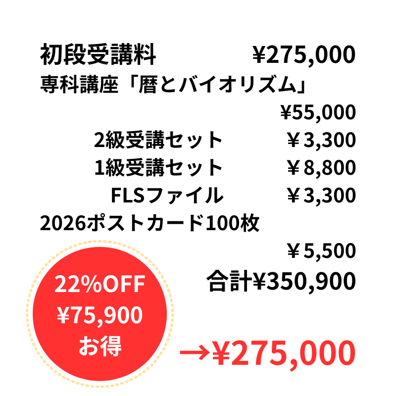 すでに初段の方でも、学び直しをしたいという方は¥11,000のお支払いを受けて参加可能とします。受講セットや販促物の提供を行います(¥20,900相当)専科講座は付随しません。(専科講座の受講もセットで希望する場合は¥55,000で受講セットや販促物を提供します。つまり¥20,900お得。ただしこちらの選択肢は申込画面にありませんので個別にご相談くださいね)