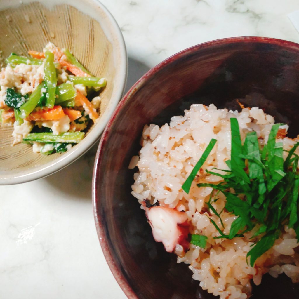 🍳蛸と梅の炊き込みご飯と小松菜の白和え🍳